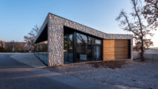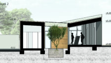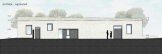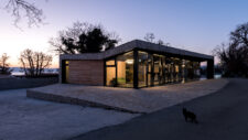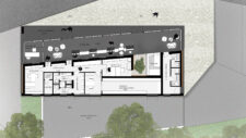 The floor plan deviation is reflected in the roof plane with an accentuated horizontal indentation, creating a dynamic entrance eave whose height continuously “grows” (up to the ridge height of the old market), while the height of the reception area’s facade remains constant, following the indentation. The deviation of the facade and the dynamics of the eave are emphasized by the external surroundings, which with its orthogonal system negate this deviation.