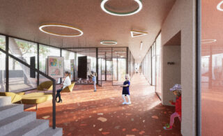 Osnovni volumen vrtića čvrsto „drži“ jugoistočnu granicu čestice, stvara pročelje ulice i gabaritima korespondira s visokim građevinama na jugu, dok se dvorištu ostavlja najviše prostora. Prostori unutar dvorišta se slobodnije formiraju, a postojeća gradnja postaje jedan od slobodno položenih elemenata.